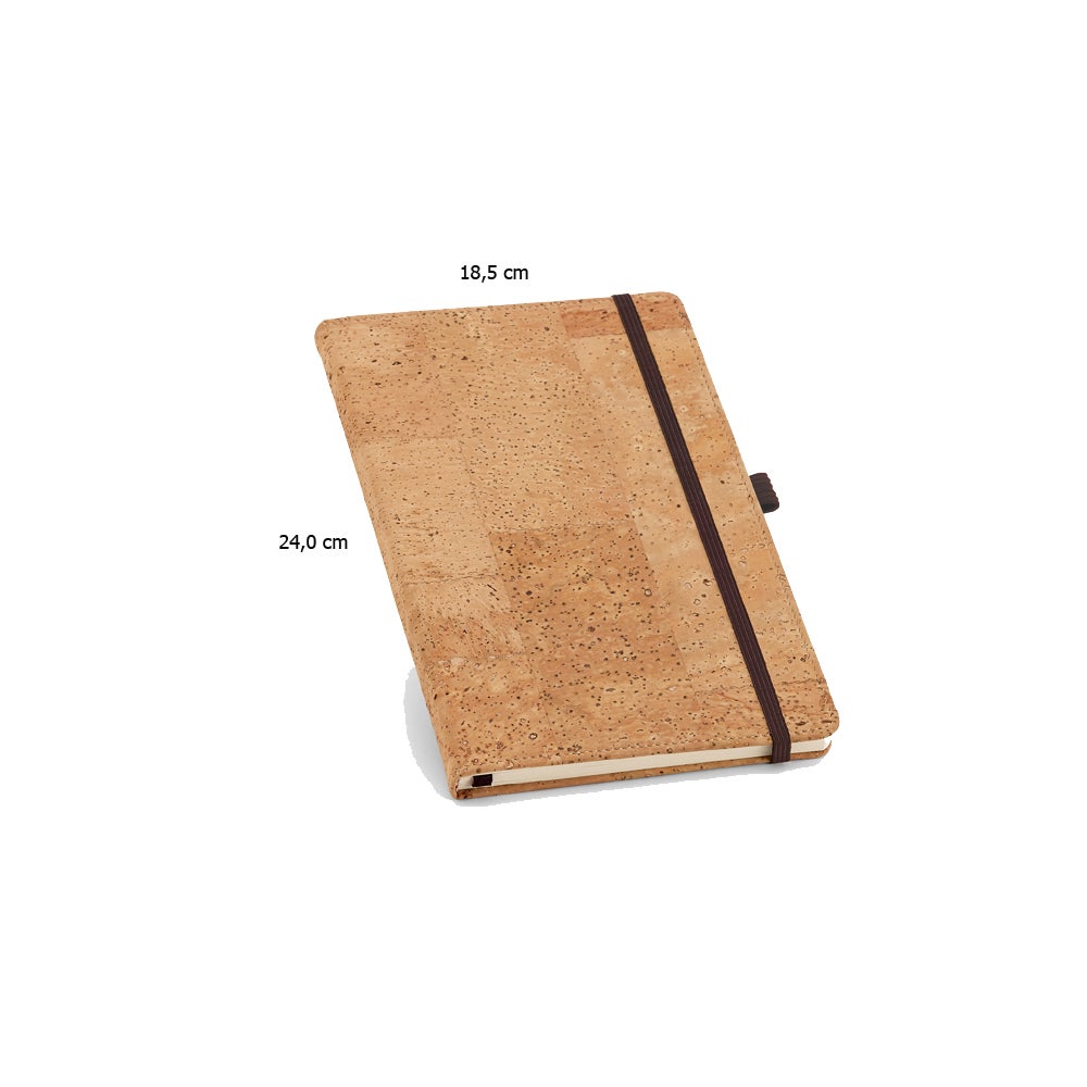 Caderno A5 com capa dura em cortiça, 80 folhas lisas em cor marfim, fita separadora, elástico e suporte para esferográfica (não inclusa).REF: 1213