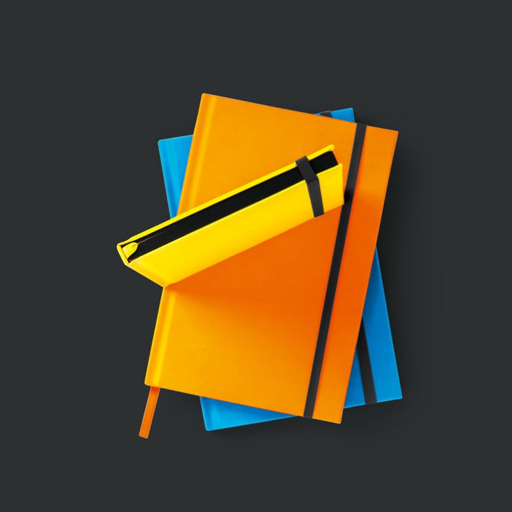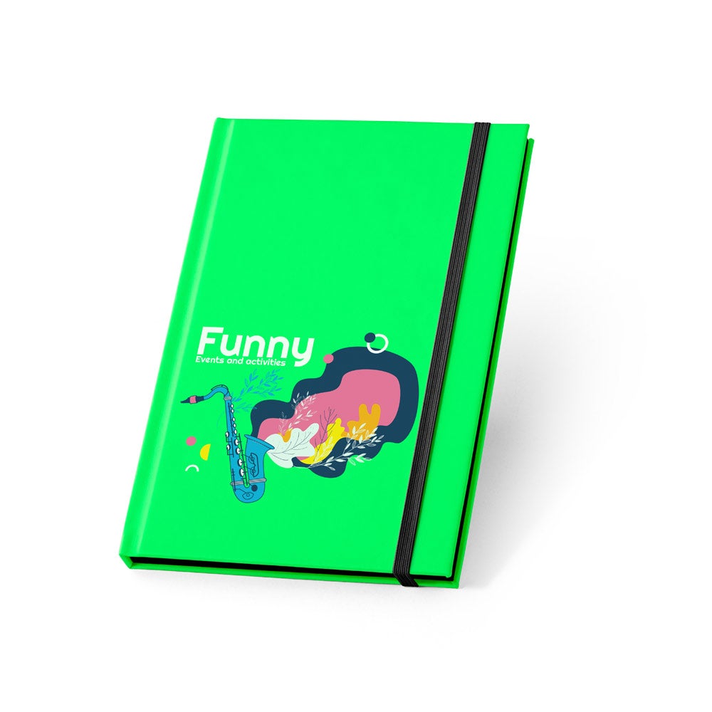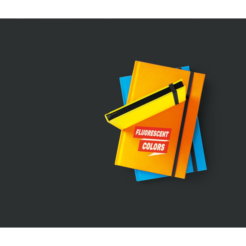Caderno A5 com capa dura fluorescente. Contém 96 folhas pautadas brancas com a borda em preto, fita separadora e elástico. REF:1238
