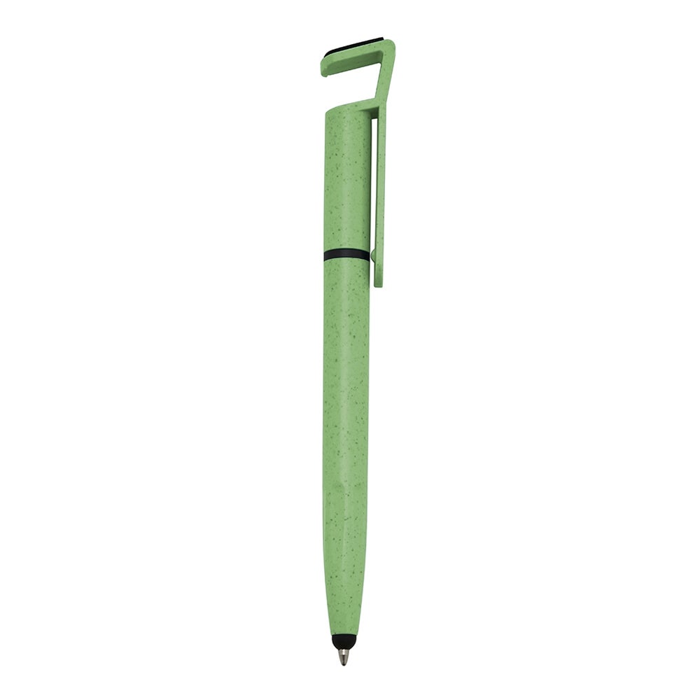 Caneta fibra de bambu com suporte para celular, ponteira touch screen e limpador de tela. Carga esferográfica azul e acionamento por rotação. REF:1353