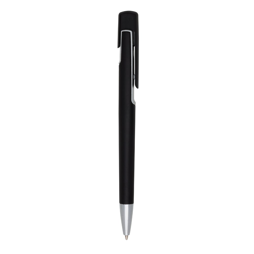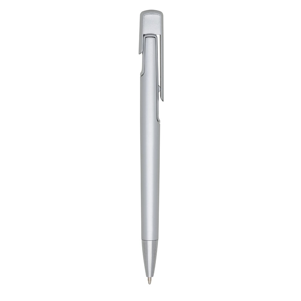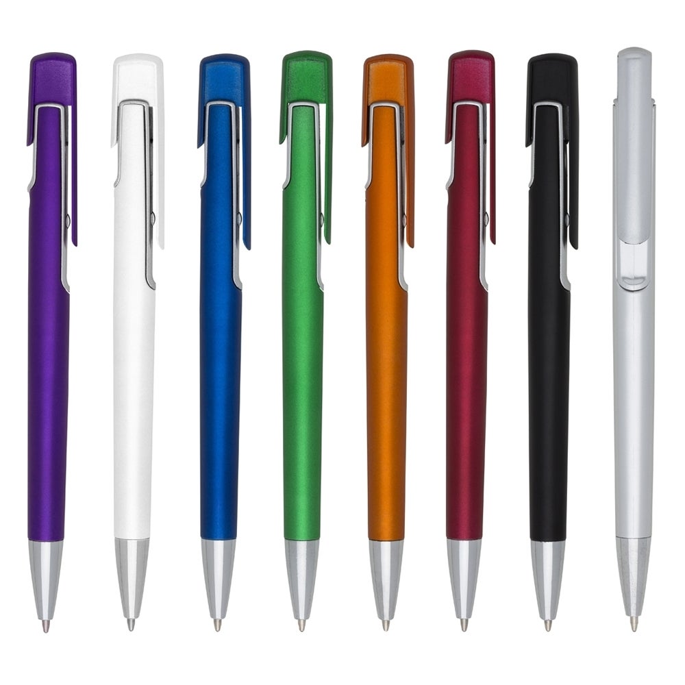 Caneta colorida com detalhes em prata e acionamento por clique, com carga esferográfica azul. REF: 1421