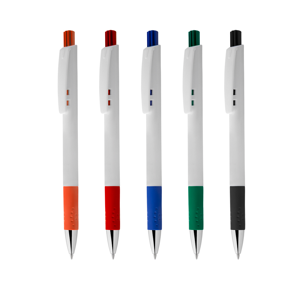 Caneta retrátil branca com detalhes coloridos, ponteira metalizada e escrita em azul. REF.: 1346