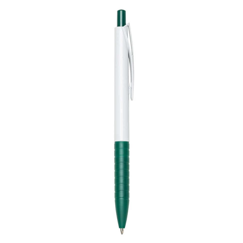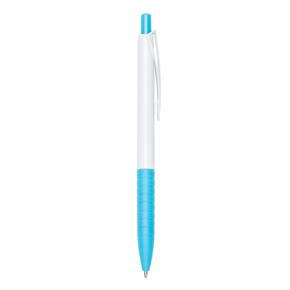 Caneta branca com detalhes coloridos. Carga esferográfica azul e acionamento por clique. REF:1343
