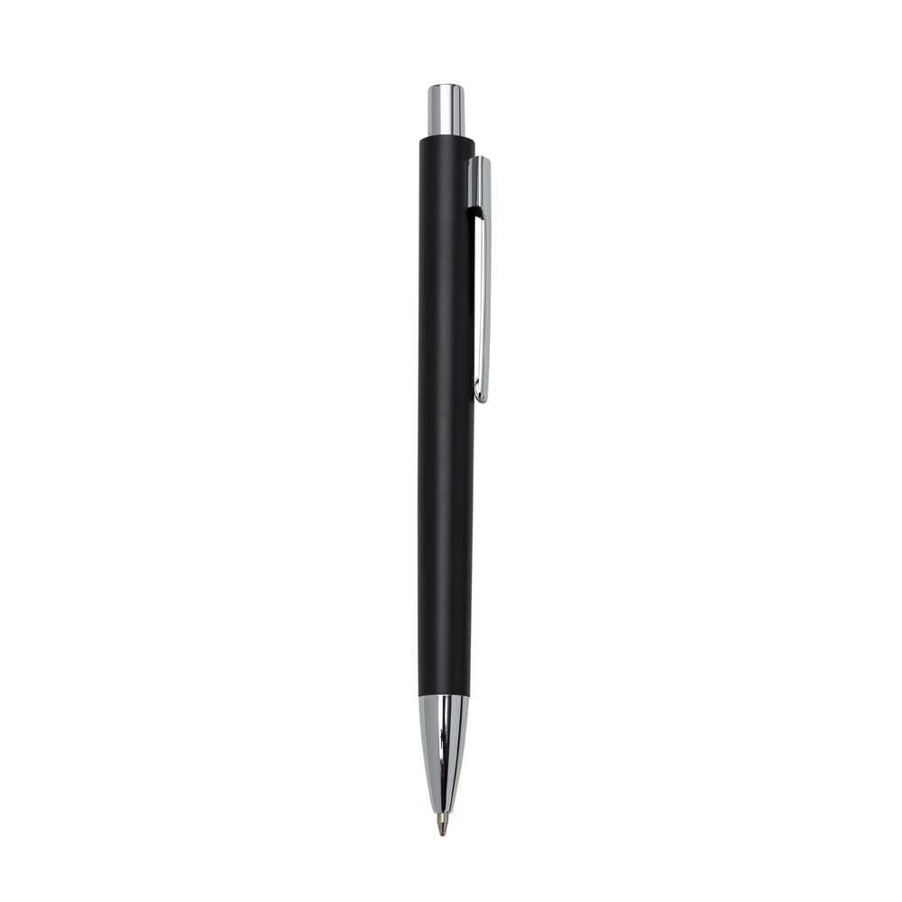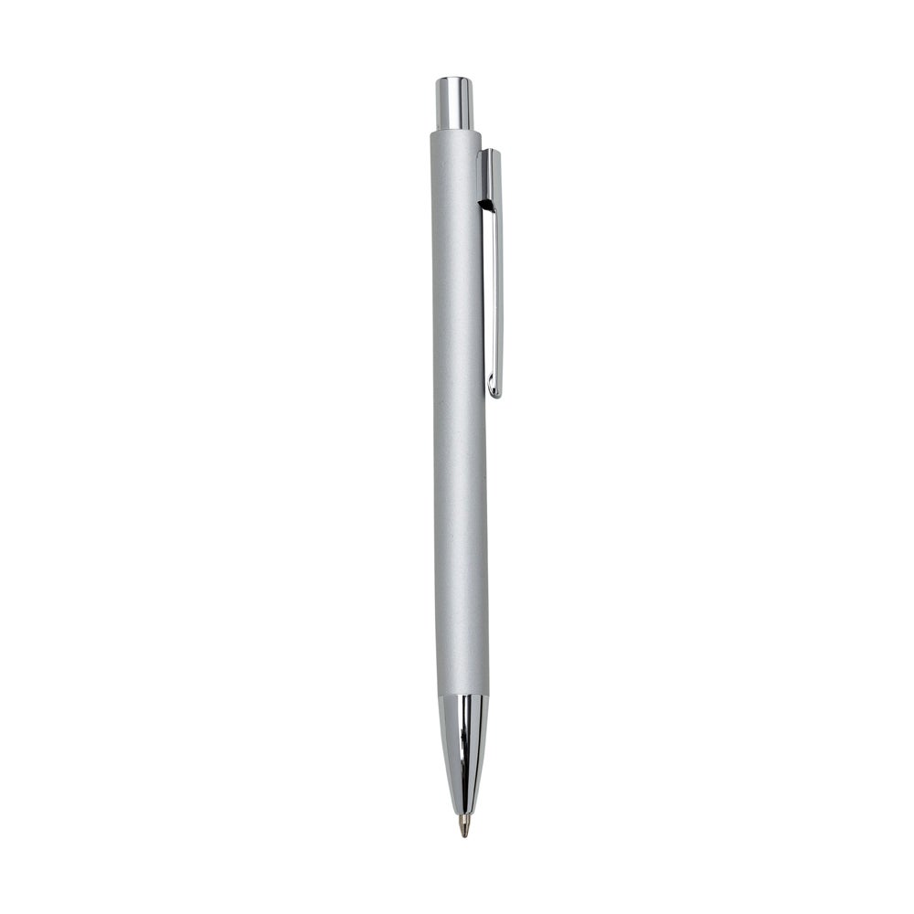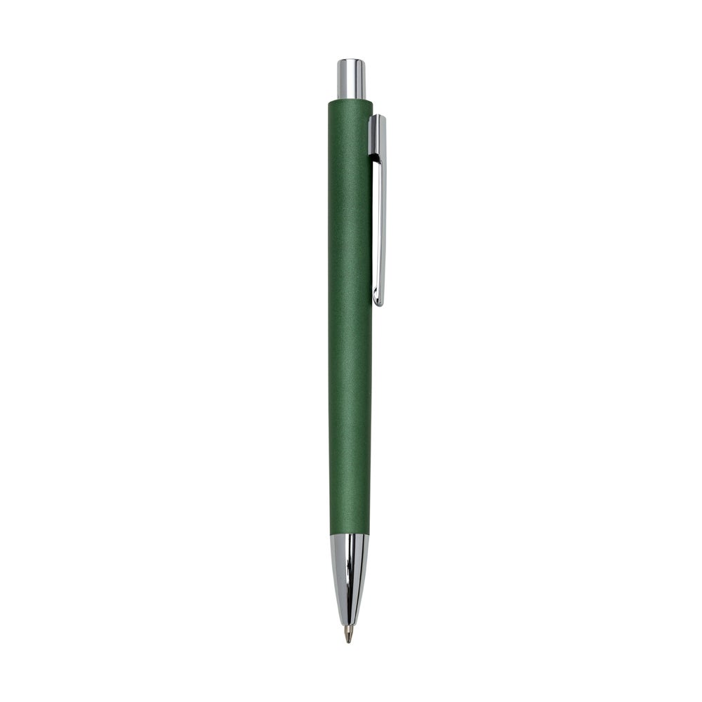 Caneta metal colorida com detalhes prata, carga esferográfica azul e acionamento por clique. REF: 1383