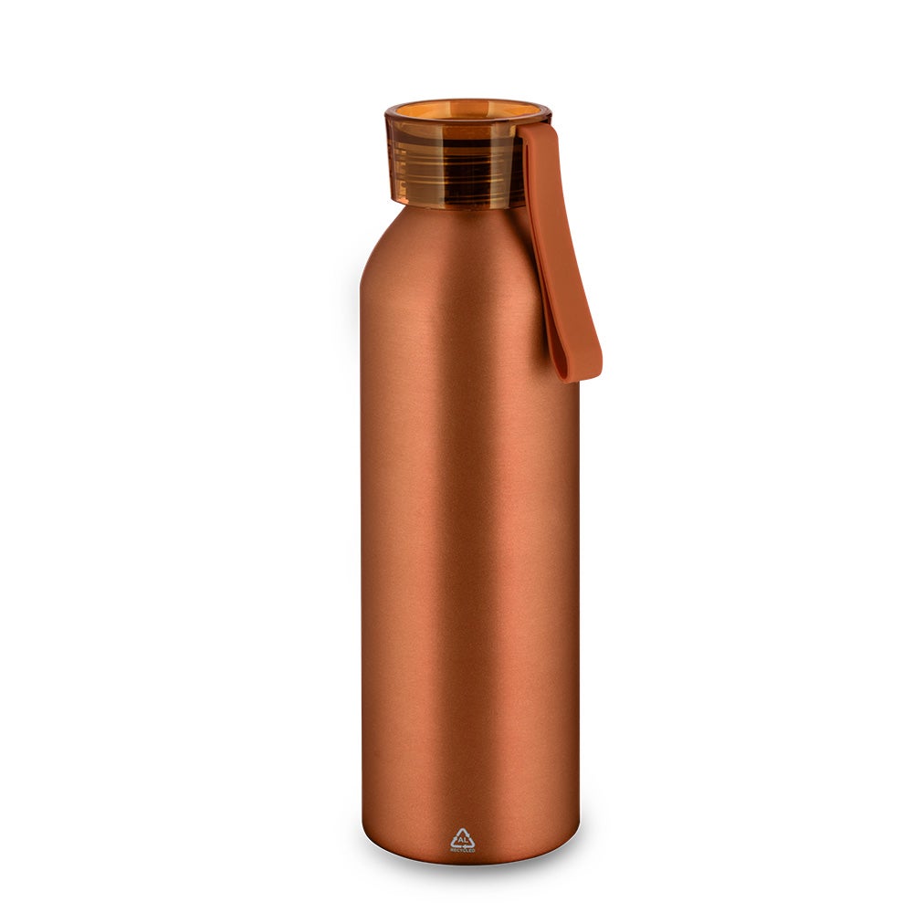 Garrafa em alumínio reciclado acabamento mate com capacidade 600ml. Tampa rosqueável em plástico e alça de transporte emborrachada. Produto pode ser personalizado