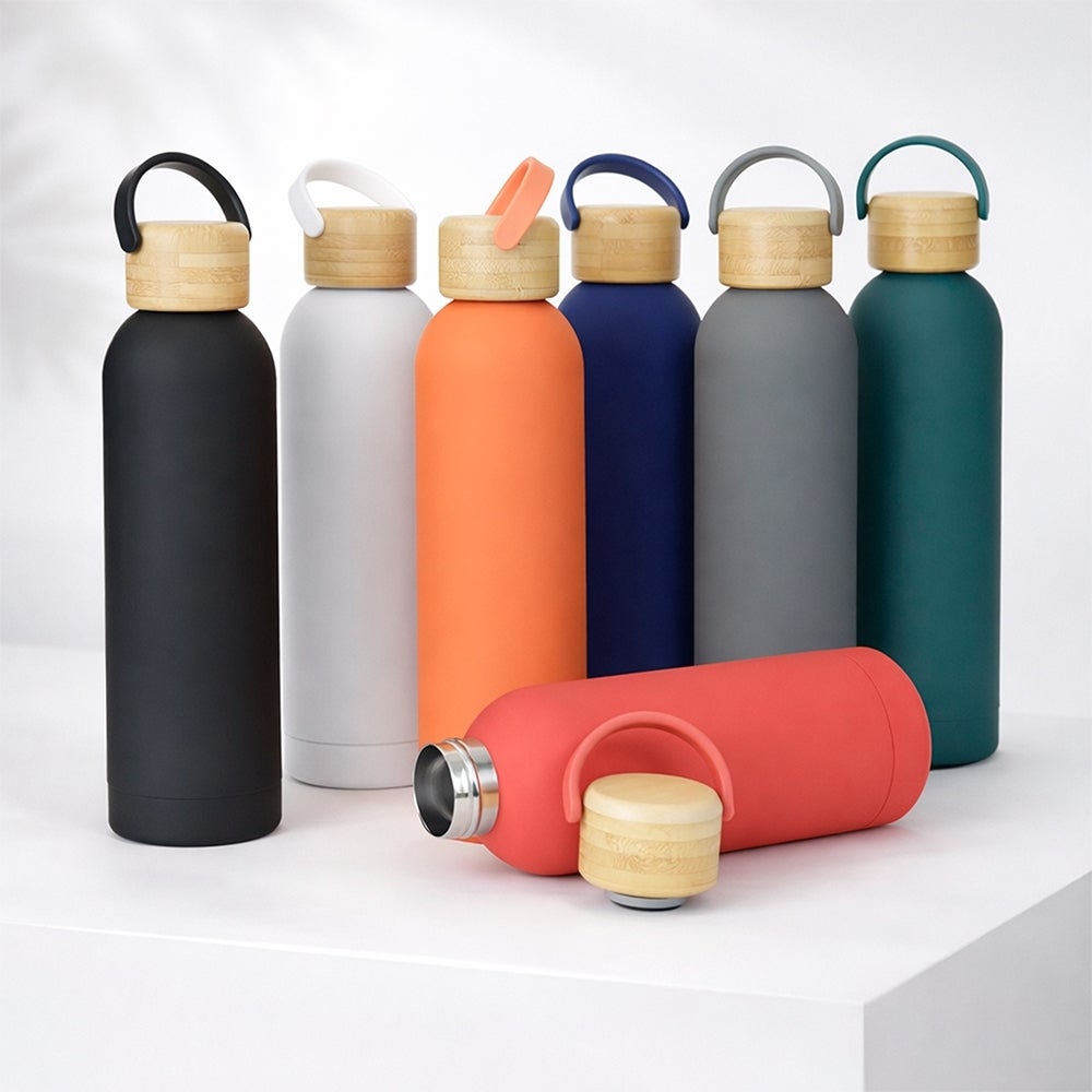 Garrafa térmica em inox com pintura emborrachada e capacidade para até 500ml. Possui estrutura de parede dupla e vedação a vácuo que permite conservar a temperatura de bebidas por mais tempo, além de tampa rosqueável em bambu com alça plástica para transporte