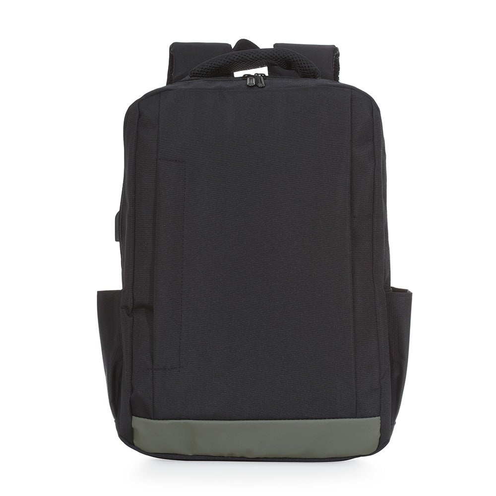 Mochila de nylon 21 litros com dois compartimentos, sendo o principal com bolso para notebook 15,6. Com divisórias internas para acessórios, a mochila possui bolsos laterais, suporte externo usb, duas alças de mãos e alça para engate em malas de viagem