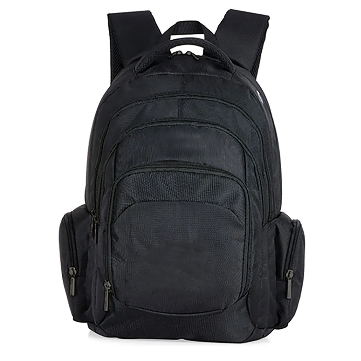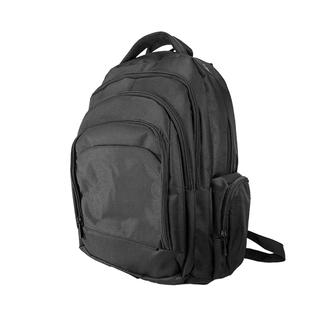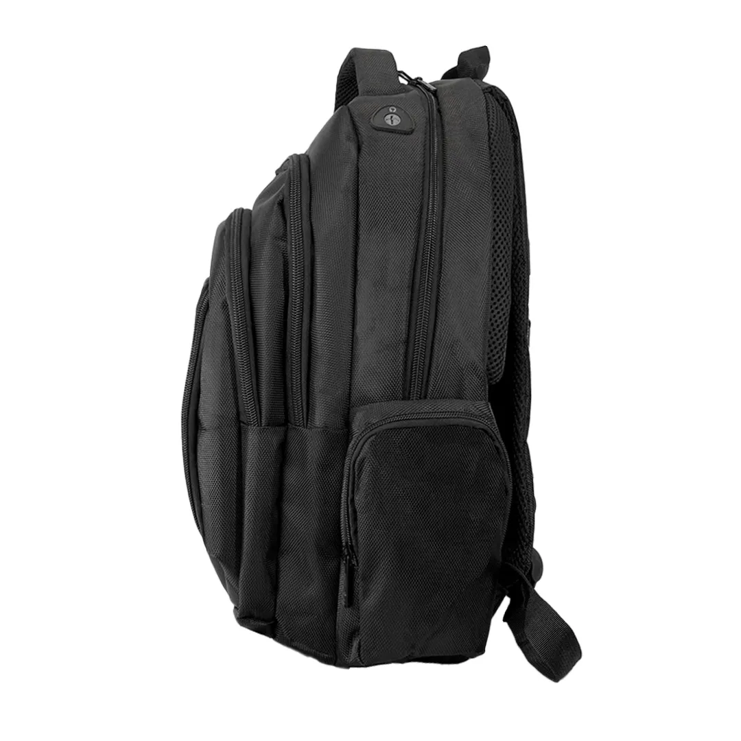 Mochila em nylon 168D, com 1 compartimento acolchoado para notebook 15,6", 1 bolso grande com zíper, 1 bolso médio frontal, 1 bolso pequeno frontal e 2 bolsos laterais externos com zíper. As alças de ombro são acolchoadas e reguláveis, alça de mão e encosto acolchoado com tela antitranspirante e bolso antifurto. Suporta até 8kg. REF: 2073