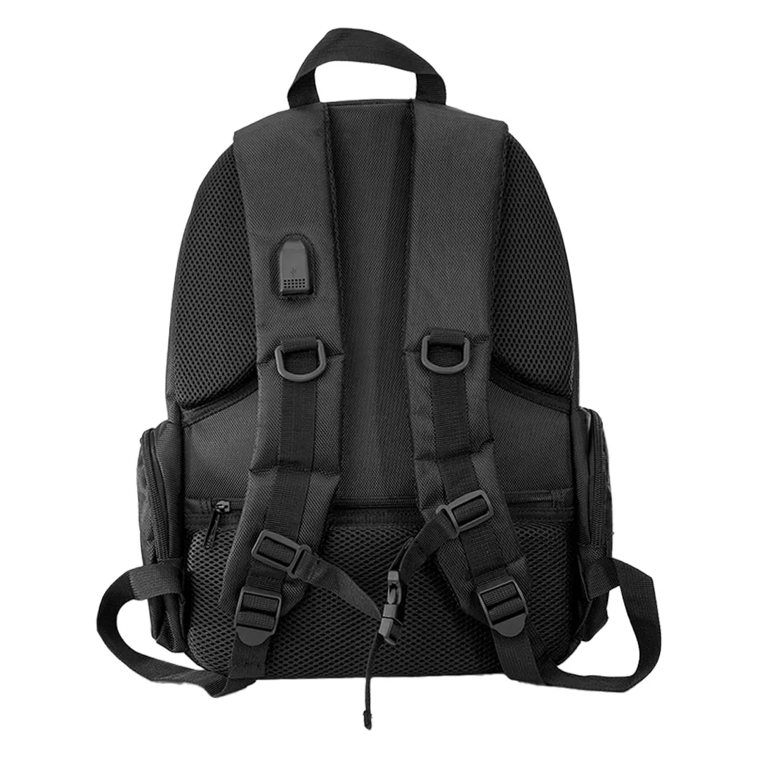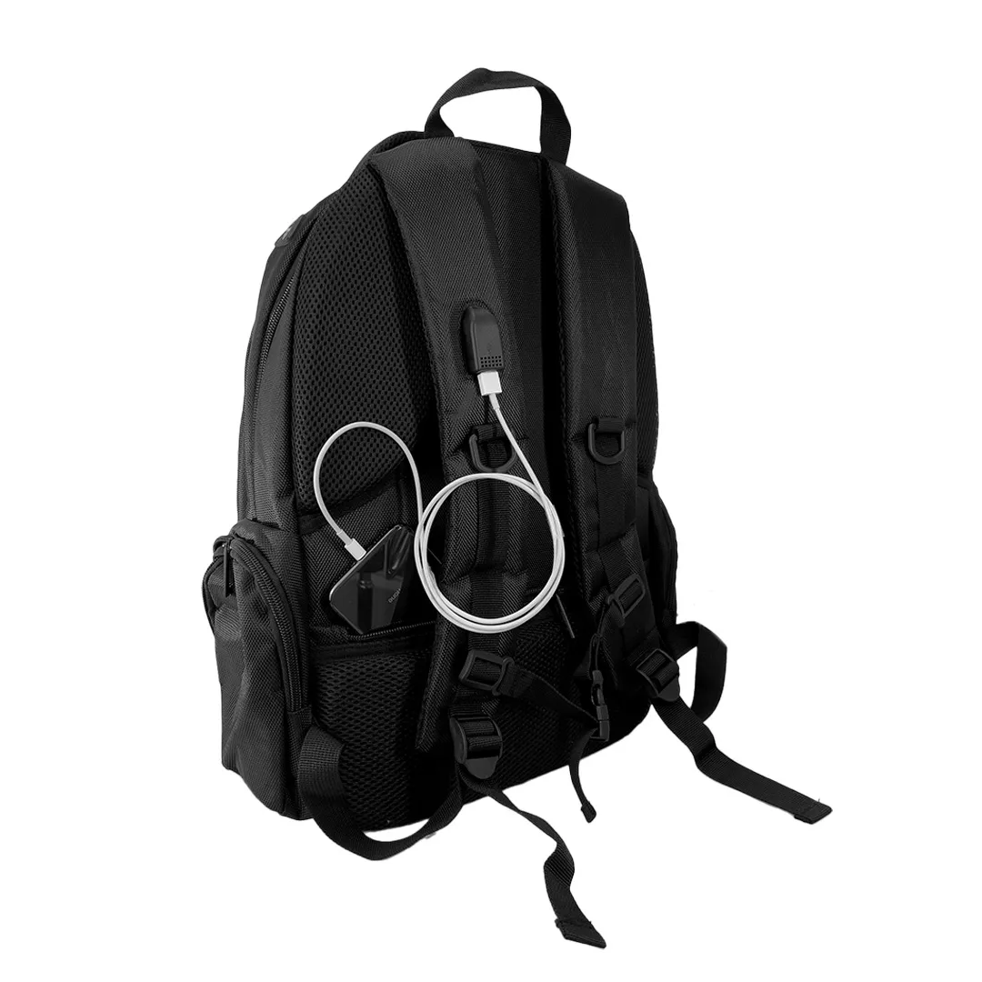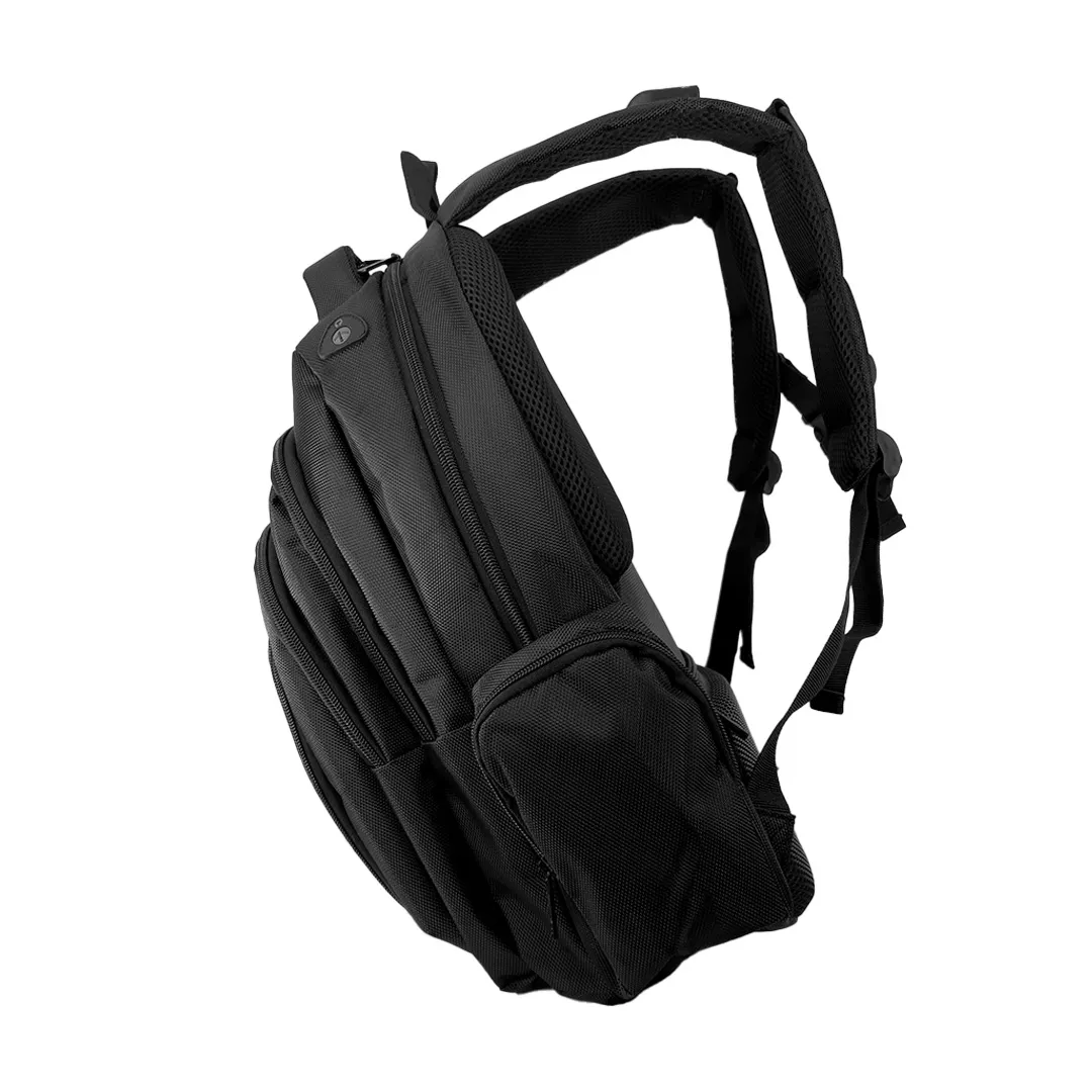 Mochila em nylon 168D, com 1 compartimento acolchoado para notebook 15,6", 1 bolso grande com zíper, 1 bolso médio frontal, 1 bolso pequeno frontal e 2 bolsos laterais externos com zíper. As alças de ombro são acolchoadas e reguláveis, alça de mão e encosto acolchoado com tela antitranspirante e bolso antifurto. Suporta até 8kg. REF: 2073