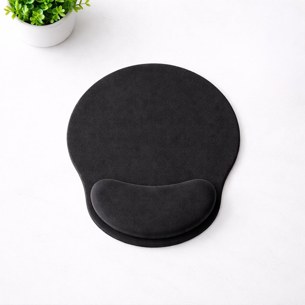Mouse pad ergonômico de estrutura flexível. Contém superfície em poliéster e base em borracha com textura antiderrapante, além de espuma ergonômica para o punho